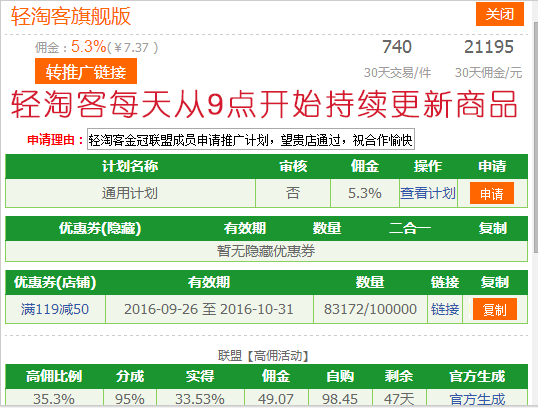 通用计划省钱这个层次只要稍稍了解一下淘宝客就能掌握,非常简单。但是也会错过很多东西,虽然联盟后台在10月10日改版能够看到内部券了,但通过移动端暂时仍旧会错过内部券,很大概率错过高佣。