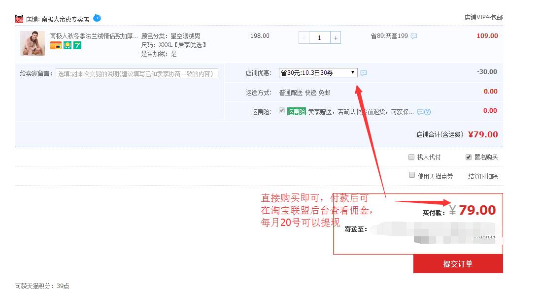 购买完成之后,淘宝联盟会根据商品的佣金比例给你淘宝联盟账户返佣,扣除税收和技术服务费之后每个月的20号可以提现。