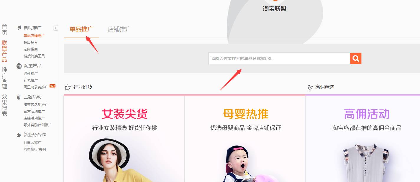 当注册好一个账号之后,你进入淘宝联盟的后台,看到联盟产品推广,接着点开单品推广,你可以在这个搜索框里搜索你想要的商品的名称,或者搜索你想买的商品的链接(可以验证是否参加了淘宝客推广)。