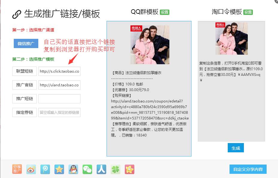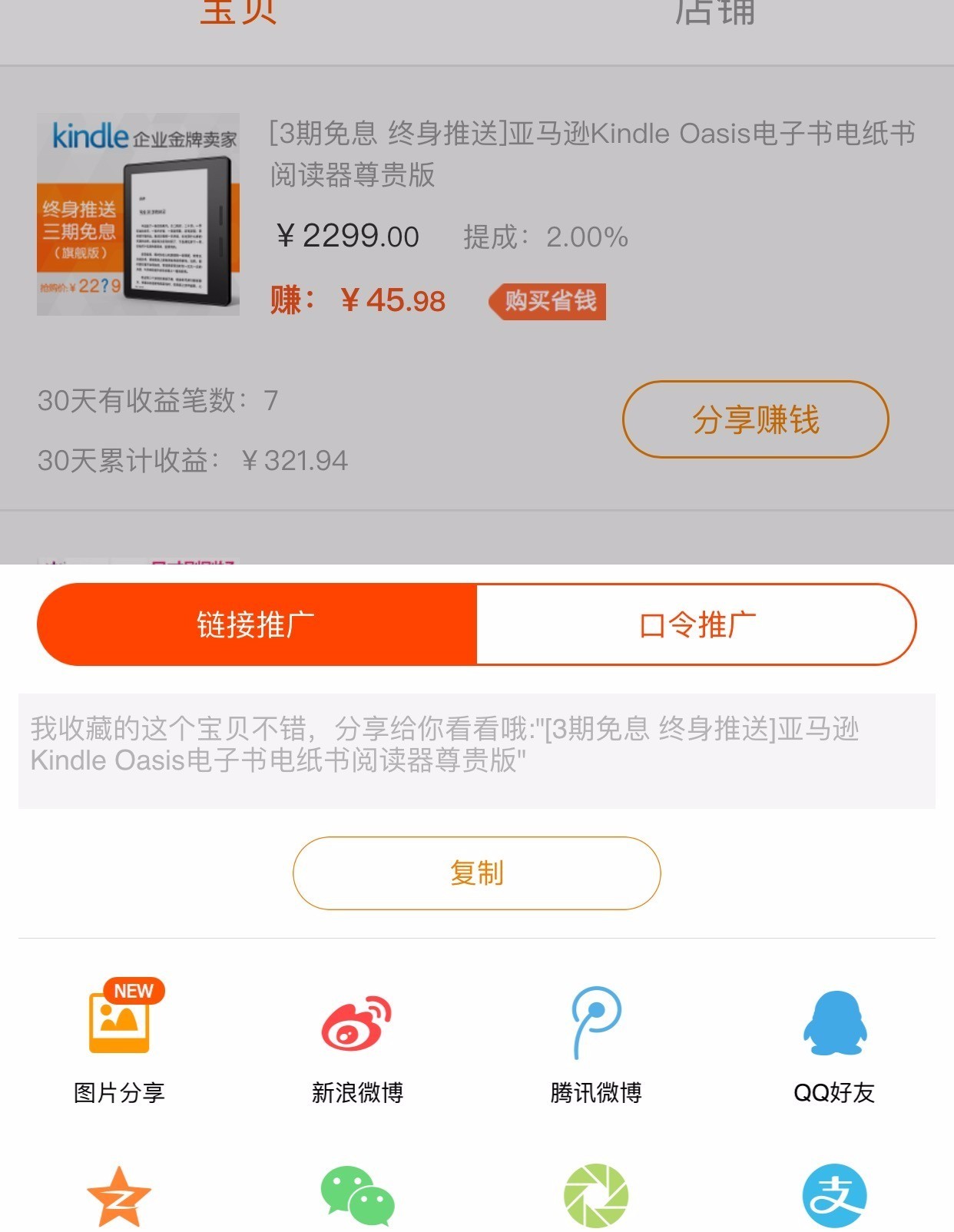 点击分享赚钱会出现一个口令推广(最初主要用来规避微信对淘宝链接的屏蔽)和链接推广按钮,推广相应链接或淘口令让买家去买,你就可以赚佣金。