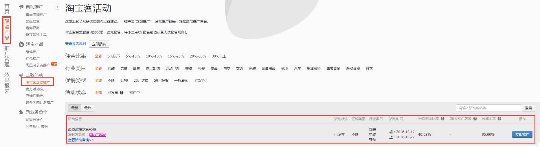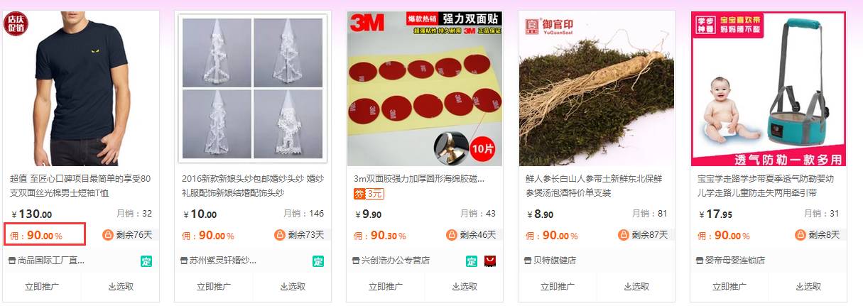 打开淘宝联盟后台的时候,会看到一个联盟产品单品推广有个高佣活动,这里的商品返佣比例10%起,最高能达到90%,者就意味着一个十块钱东西可以给你返9块(还会扣技术服务费)。