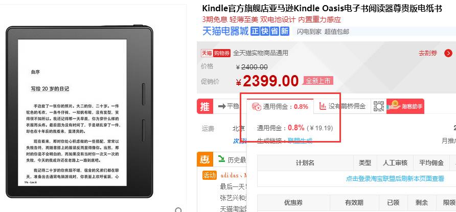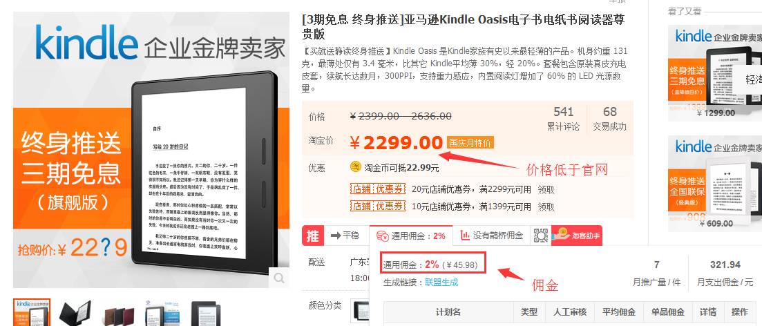 举个例子,前阵子俺买了个kindle oasis,一般来讲大牌都不参加淘客推广,如果有返佣比例也非常低。而在XX科技他有这么一款不但比官网便宜100块还可以返利40几块。他单卖裸机的话甚至会亏本卖,敢这么搞还在于它有套餐一,套餐二,套餐三,搭配附件去卖,客单最高可以拉到2536,这时他就可以挣了。还有一个送免费的终身推送服务,这就是让你去他的微信公众号,只要沉淀到公众号,就可以对你进行持久的一个营销。