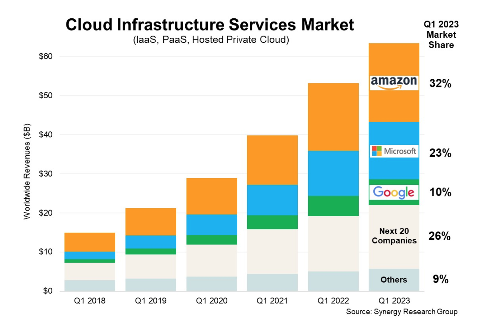一季度,AWS的总销售额同比增长15.8%,虽然214亿美元的成绩超出了分析师普遍预期,但跟其竞争对手Azure和谷歌云一样,开始经历销售增长的放缓。在两天前的微软和谷歌财报中,Azure云业务同比增长了27%,而谷歌云业务增长了28%,二者虽在市场份额上落后于亚马逊,但云业务增速都超出了AWS。