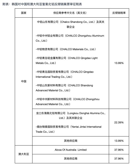 据中国贸易救济信息网,4月28日,韩国企划财政部发布第2023-94号公告,依据企划财政部第990号令,决定自即日起对原产于中国和澳大利亚的氢氧化铝征收为期5年的反倾销税,其中,中国为13.99%~22.39%,澳大利亚为37.96%;与此同时,对中铝山东新材料有限公司和中铝中州新材料科技有限公司生产的型号为HC110A、HC110KK、H-WF-60-SP、H-WF-75、H-WF-75-SP、H-WF-90、H-WF-90-SP、H-WF-100、H-WF-50C-SP,白度(YS/T 469-2004)超过90,制造人造大理石的氢氧化铝不征收反倾销税。