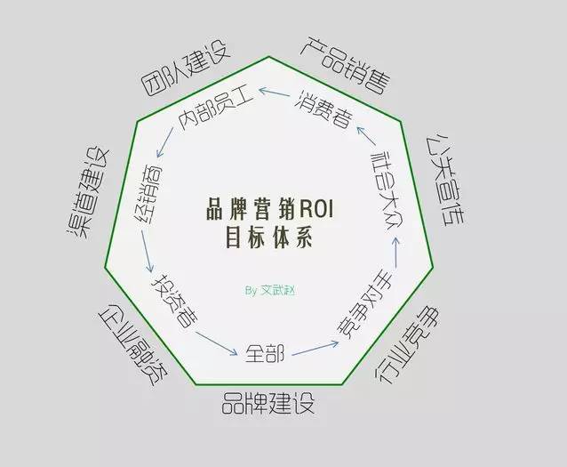 我们都知道,传统媒体的传播是一种大而全的传播模式,而社会化媒体的出现改变了这一点,内容的分层化、形式的多样化、用户的圈层化成为趋势。从细分的角度看,营销的ROI评估也不再是一种大而全的体系。从营销目标角度,我们可以针对不同的利益相关群体分为7个大的维度:品牌建设、产品销售(消费者端)、渠道建设(经销商端)、公关宣传(社会公众与政府端)、融资(投资者端)、企业文化建设(员工端)、行业竞争(对手端)等。