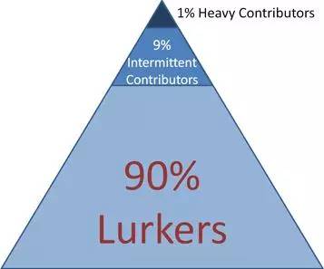美国网络专家Jakob Nielsen曾经提出一条网络社区90-9-1法则:在网络社群中,90% 的参与者只看内容并不参与互动,9% 的用户会进一步参与讨论,而只有 1% 的用户会积极去创造内容。