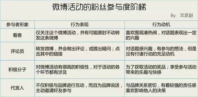 在2011年的时候,我曾经提出过一个微博粉丝参与度的阶梯模型:品牌的微博粉丝形成了“看客-评论员-积极分子-代言人”的四层序列,微博营销活动的参与者数量逐渐递减,但同时参与质量也越来越高。相比高参与度的“积极粉丝”和“代言人”,处于低参与度的“看客”“评论员”同样重要,因为他们可以传播活动的信息,充分为品牌的微博活动造势,形成轰动效应。