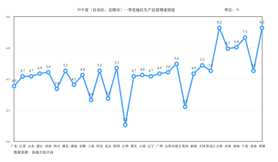 截至4月28日,除福建外,全国其他30个省份(自治区、直辖市)均已公布了一季度经济成绩单,有23个省份GDP增速跑赢4.5%的全国水平。从区域来看,东北地区整体表现最佳,三个省份经济增速均跑赢全国水平。