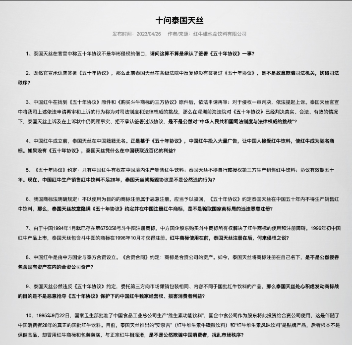 此文是对同日华彬集团发布文章《十问泰国天丝》的回应。在《十问泰国天丝》中,华彬集团针对近日泰国天丝出具的关于红牛商标案的两个一审判决结果进行反击,并以“故意欺骗司法机关,妨碍司法秩序”“违法恶意注册商标”等字眼指责泰国天丝,措辞颇为激烈。