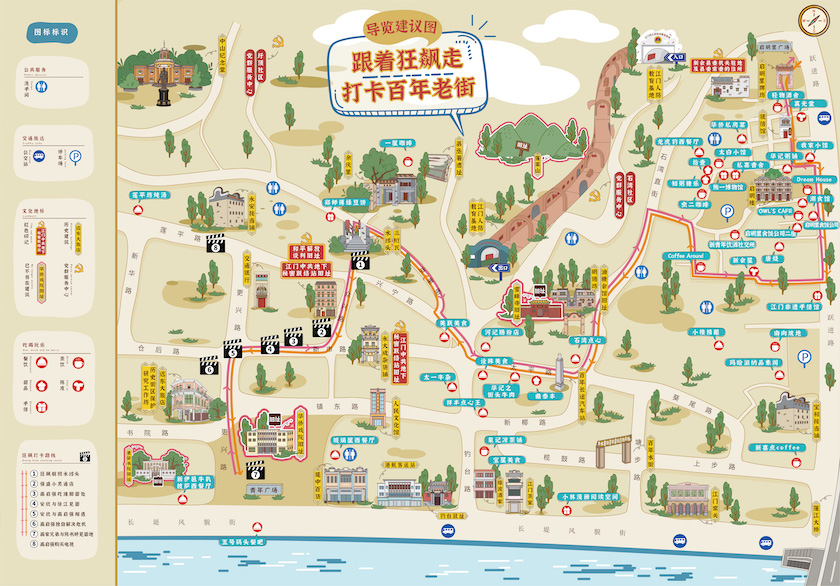 为方便游客游览参观,结合启明里历史街区的旅游、餐饮点,绘制出一份“跟着《狂飙》走、打卡百年老街”的手绘导览图,串联取景点、文化地标、餐饮、手信店,放在青年广场附近多个显眼位置,让游客随时可拿着地图指引,走遍整个历史街区。同时,为进一步吸引自来客、散客留在江门,江门市文广旅体局策划推出世遗文化深度游、观鸟赏花生态游、滨海度假休闲游、乡村民宿体验游、中医温泉康养游、五邑家宴美食游、红色教育研学游等7条主题鲜明的精品旅游线路,以我市重点景区为节点,将沿途美丽乡村、特色民宿、本土美食等资源串珠成链,并融入当前热门的《狂飙》元素,供广大前来江门自驾游或组团游的消费者参考。