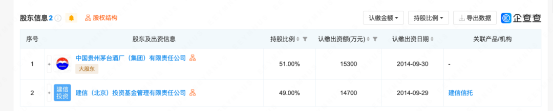 早在2014年9年,茅台(贵州)私募基金管理有限公司正式成立,曾用名为茅台建信(贵州)投资基金管理有限公司。企查查数据显示,上述基金管理公司由茅台集团与建行旗下的建信信托共同发起成立。其中茅台认缴出资1.54亿,占股51%,建信信托认缴出资1.47亿,占股49%。