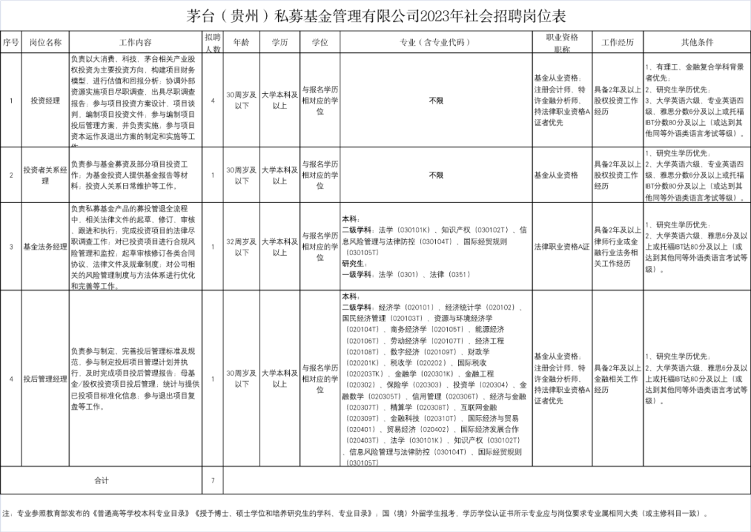 其中,投资者关系经理、基金法务经理和投后管理经理各招聘一名,而投资经理放出了4个岗位,一共7个招聘名额。