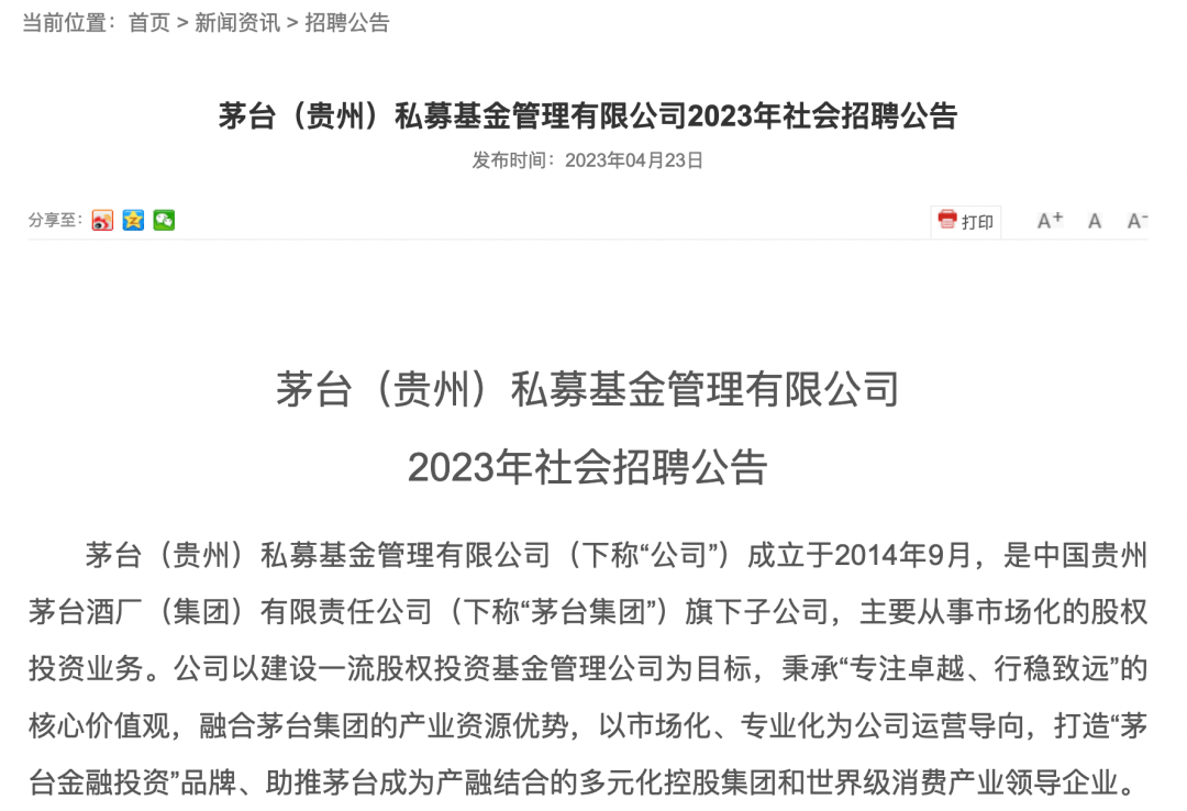 在很长一段时间里,茅台的投资团队十分低调。直至此次招聘公告,外界才得以略窥一二。根据公告,茅台(贵州)私募基金管理有限公司主要招聘四个岗位,分别为:投资经理、投资者关系经理、基金法务经理、投后管理经理。
