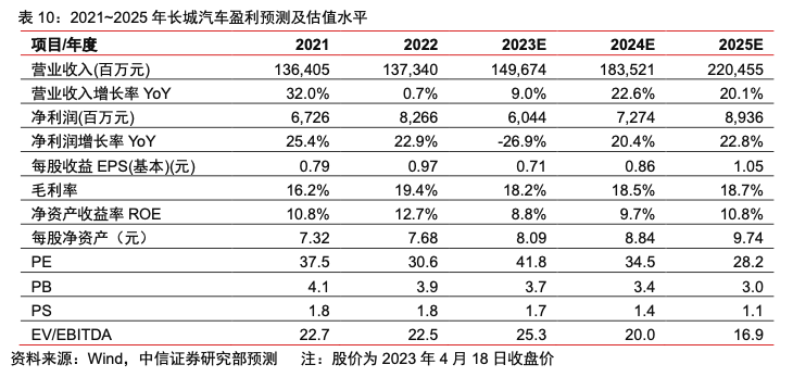 受此影响,2023年Q1,长城的单车净利润已从去年同期的0.58万元降至0.08万元,经营活动现金流净额为-82亿元。对此,中信证券表示,2023 年依然是竞争加剧的环境,长城深刻意识到行业洗牌期战略层面销量优于利润的事实,但考虑到Q1 业绩不及预期,将下调2023年EPS至0.59元。