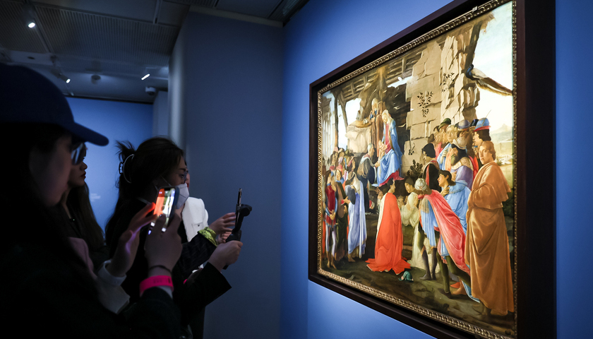 谢定伟表示,虽然展览的设计由乌菲齐美术馆承担,但具体展品的选择则是双方共同选定,“乌菲齐美术馆会先将其规划的展品清单发给我们,我们再去协商,有的画我们可能不会选择,而不在清单上的部分画作我们也要去争取。”《三博士朝圣》这一波提切利的代表作之一就是争取来的展品。
