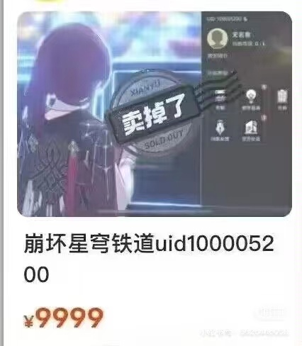 4月26日,《星铁》公测正式开启。开服后不久,就有人贴出截图,在二手交易市场闲鱼,uid为100005200的账号,标价9999,显示已卖出。而闲鱼上其他,有较为强力角色的初始账号,售价在150元左右。
