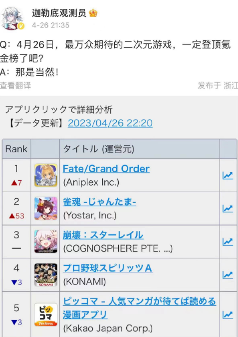 这种心态,是《星铁》玩家的一种缩影,这一点通过4月26日日本氪金榜的情况也能证明,这一天的氪金榜冠军,是发售六年多的《FGO》,而《星铁》仅排第三。