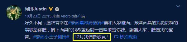 侧田还发微博表示12月会带着新歌和大家见面,