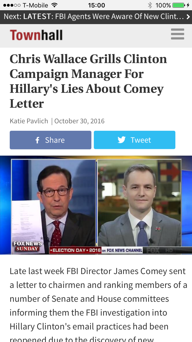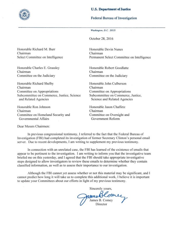 先前国会证词中我有表明,针对前国务卿希拉里·克林顿私人邮件服务器一案,FBI已结束调查。不过由于案情出现新的进展,我特此发函,对先前的国会证词做出补充。