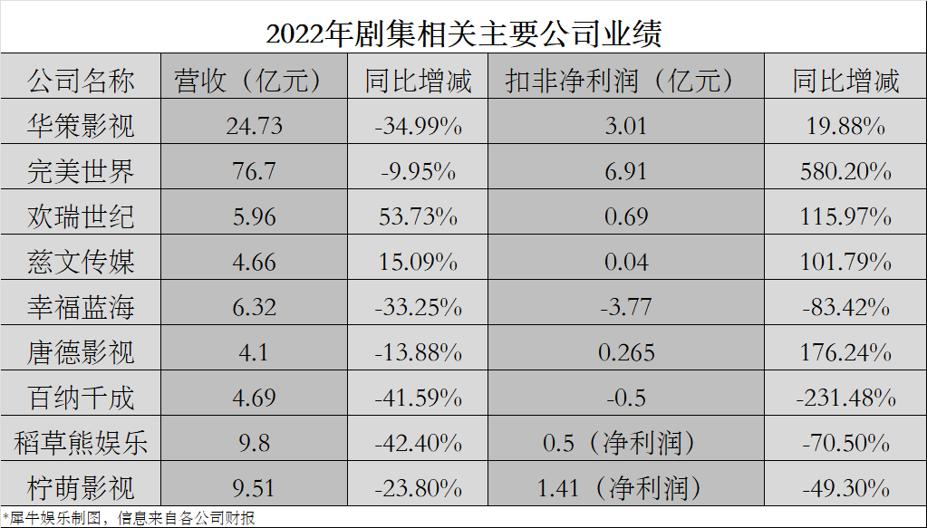 随着行业主要几家剧集出品公司发布2022年财报,一些数据让我们能更好地观察上一年。根据上市公司在剧集领域的业务相关程度,犀牛君对九家公司的业绩情况进行了简单统计。