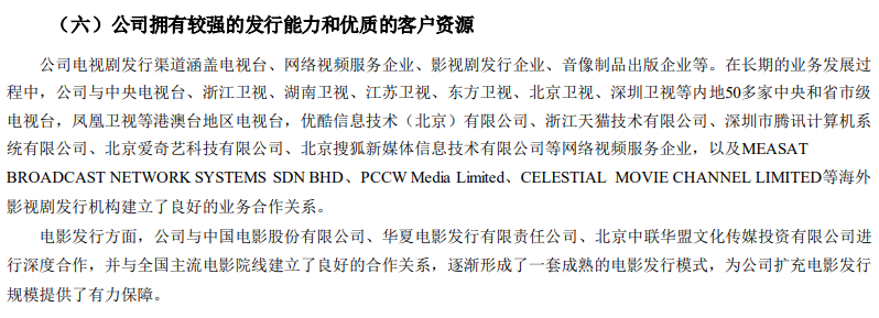 以唐德影视为例,财报中还特别梳理了公司的核心竞争力,前两条就是具备丰富影视行业经验的专业人才和优秀的经营管理团队,以及建立了唐德特色的创意人才合作机制;发行渠道提到了50多家中央和省市级电视台、港澳台地区电视台,覆盖爱、优、腾和搜狐等网络平台包括海外发行机构。