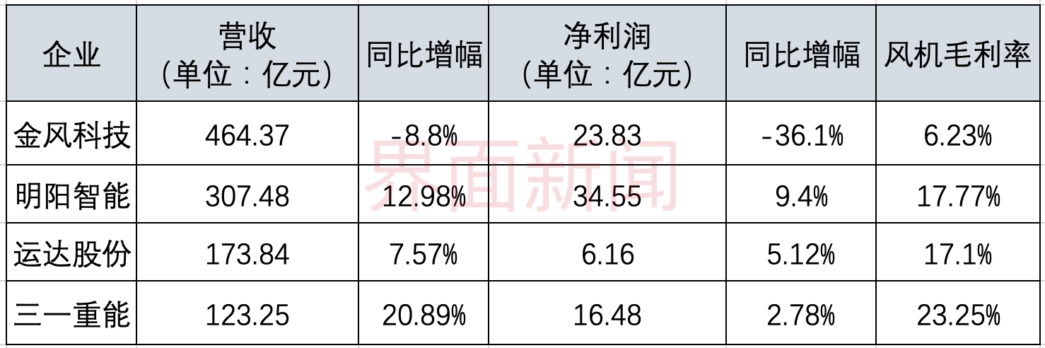 去年,国内风电老大金风科技营收、净利均下滑;运达股份净利增速为5.12%,三一重能增速为2.78%。