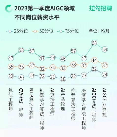 大厂布局拉动了AIGC创业潮,带来了新岗位的招聘需求。4月21日,拉勾招聘发布《2023第一季度 AIGC人才供需报告》。报告显示,2023年3月,AIGC人才岗位需求量环比增加42%,其中平均薪资最高的AIGC算法工程工程师,有25%的招聘月薪在6.8万元以上,50%的招聘在4.4万元以上,75%的招聘在3.2万元以上。
