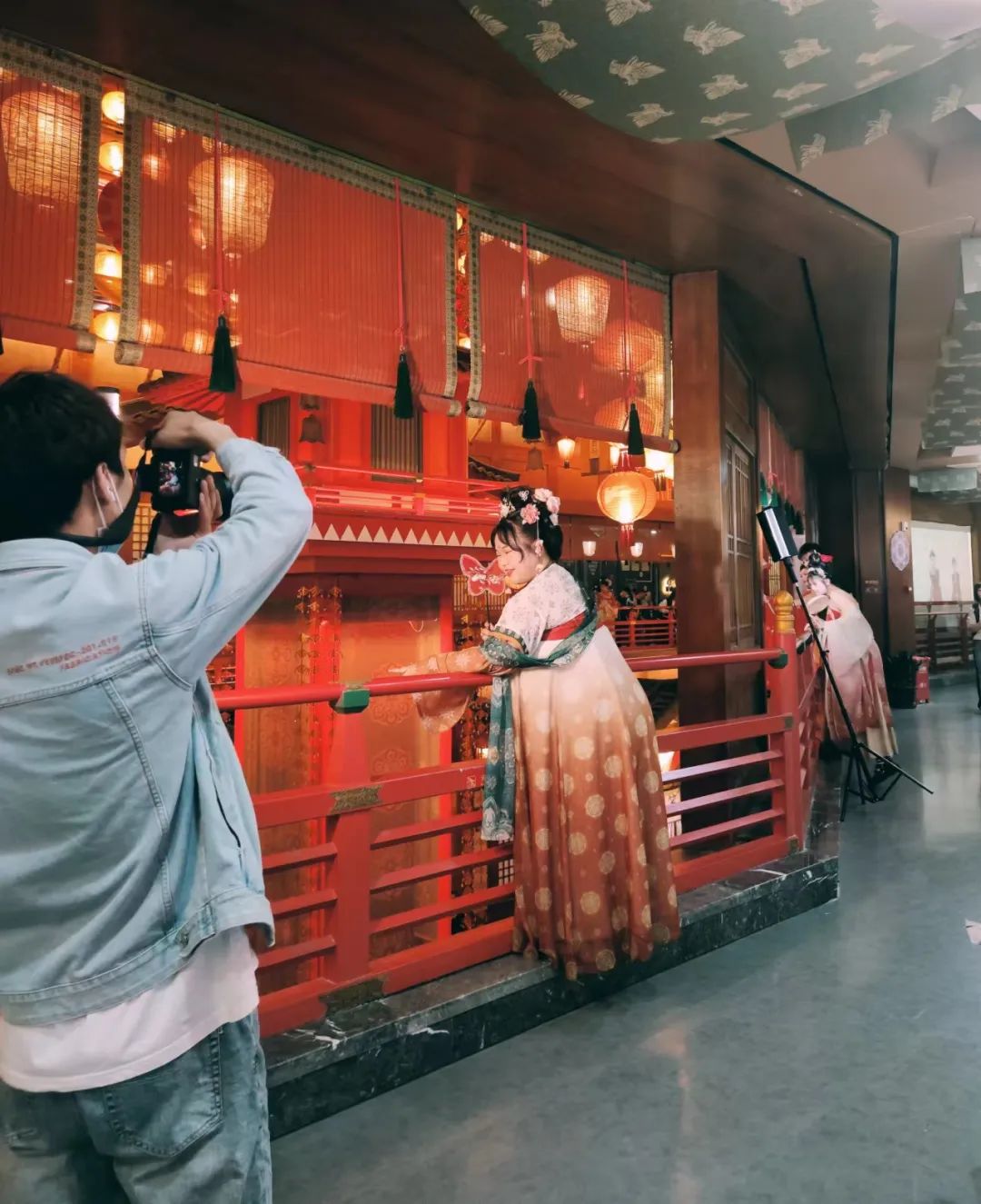 一声声“慢慢转身”,“向右看”的指令,夹杂着几句“漂亮”“再来一张”的鼓励,拍照的过程,可以说是成为唐朝人的“洗脑”环节。要忘记现代,学好动作和神韵,配上刚刚装扮好的汉服,才算做到了“人衣合一”。
