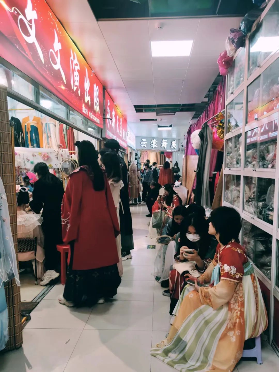 在西安,批发唐朝人已成为一种产业,其中服饰妆造是重要一环。过去,一洲商城是当地人租借演出服装的地方,如今入驻了几十家汉服妆造店。