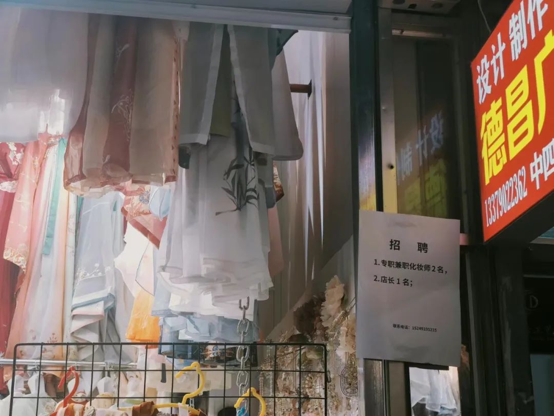 店铺外贴着招聘化妆师和店长的告示。图 / 每日人物摄