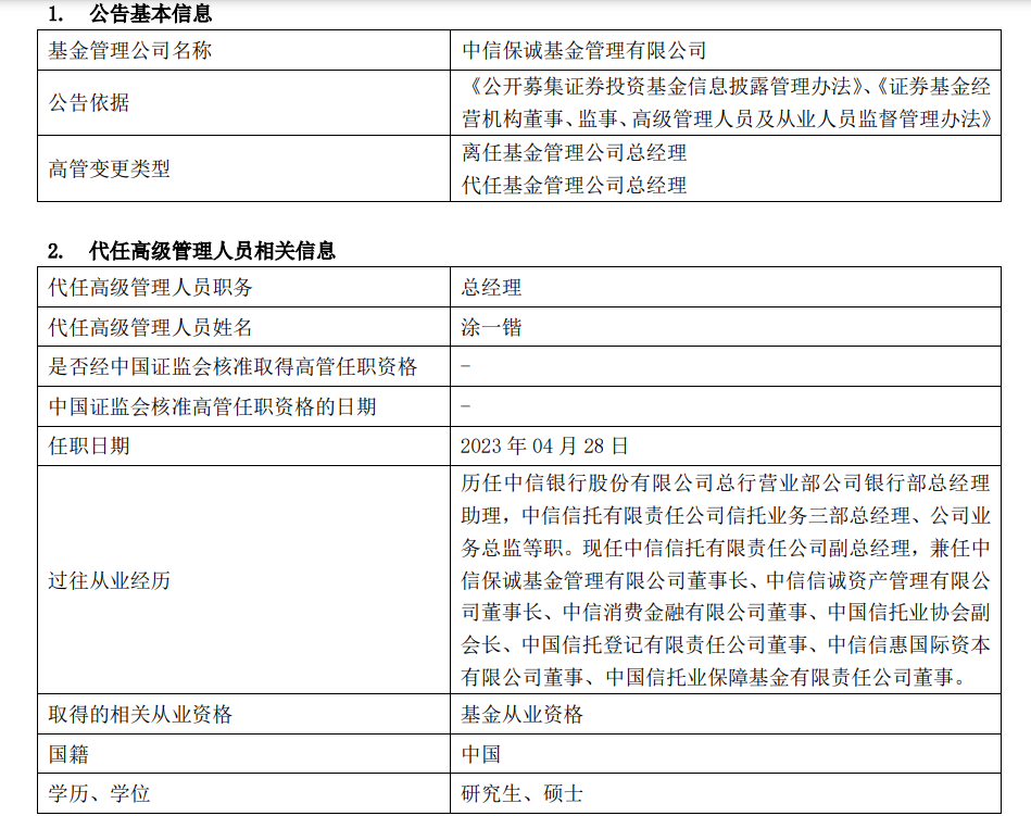 4月29日,中信保诚基金发布高级管理人员变更公告,原总经理张翔燕因退休离任,离任日期为4月28日。目前,由董事长涂一锴代任该公司总经理一职。