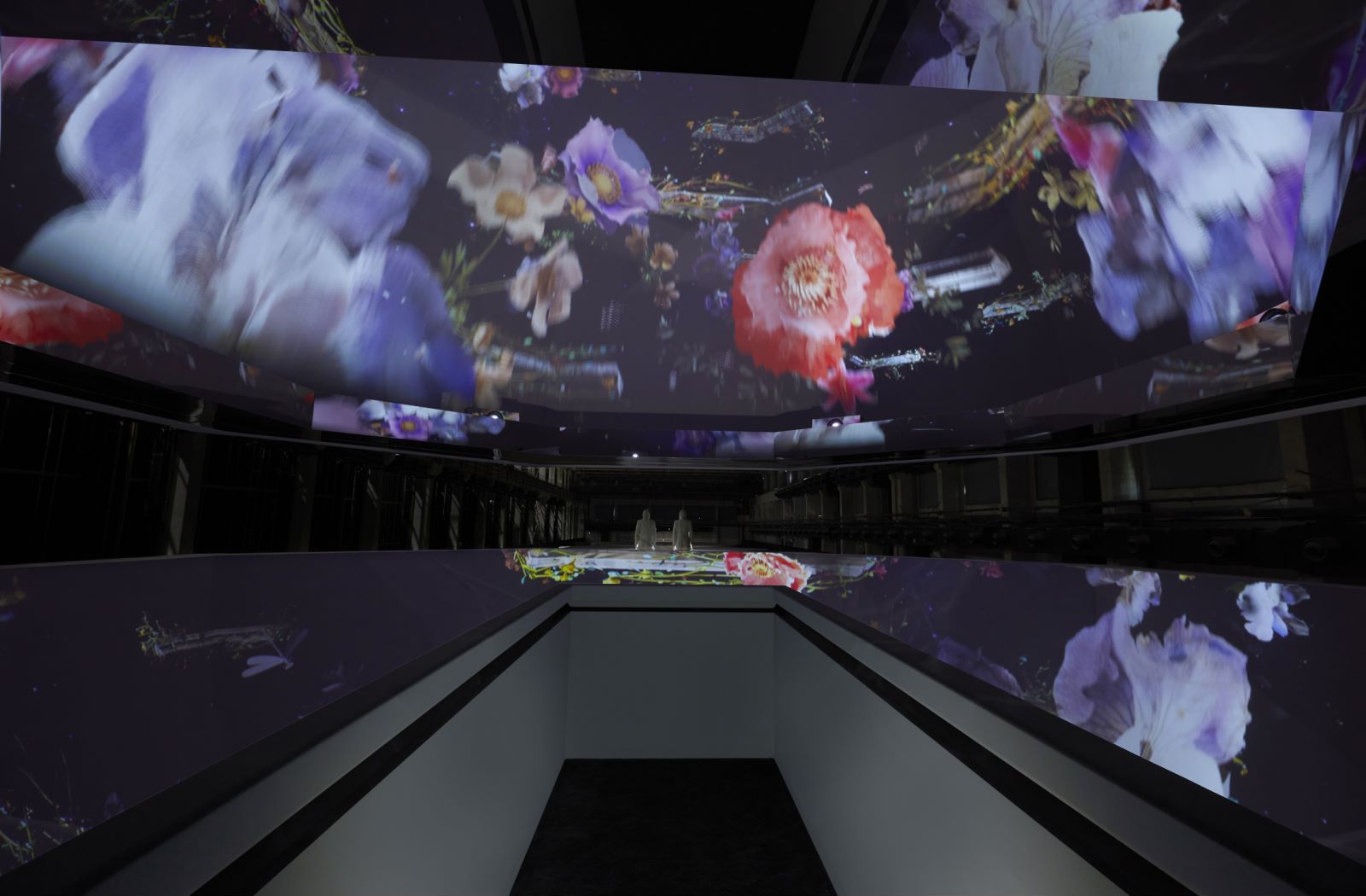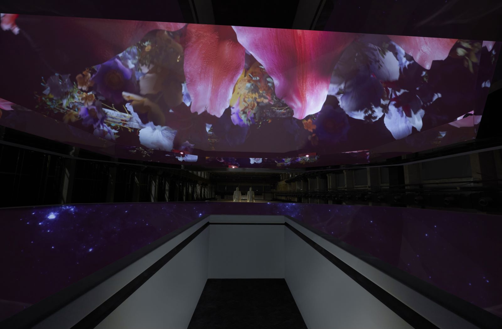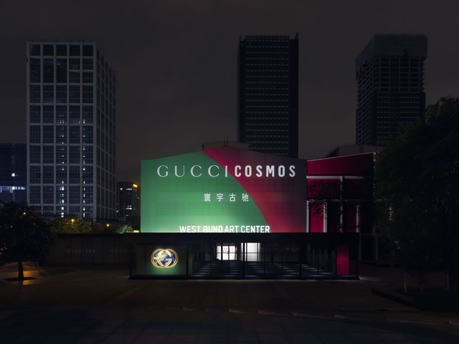 仅站在面前就已经足以感叹装置的震撼,而在观景台中央,古驰从过去至今的设计创意与图案被投射到穹顶上,其中包含以Flora花卉图案为灵感的花簇,如同万花筒般展现出一个迷人而明亮的“古驰宇宙”。