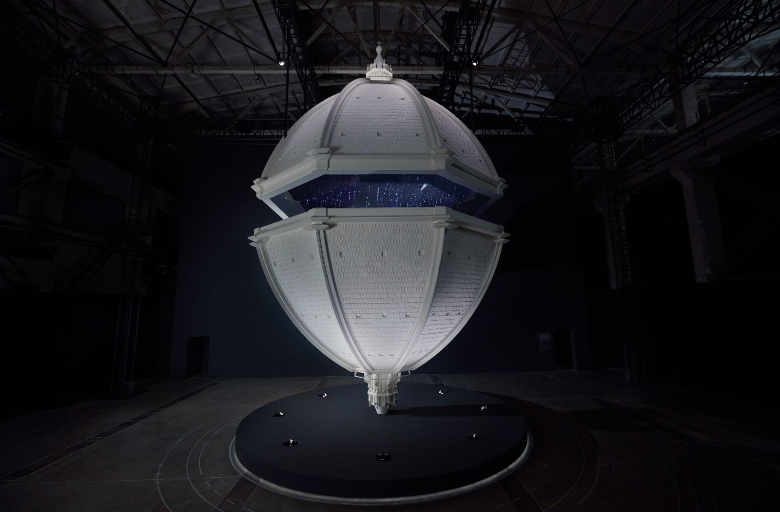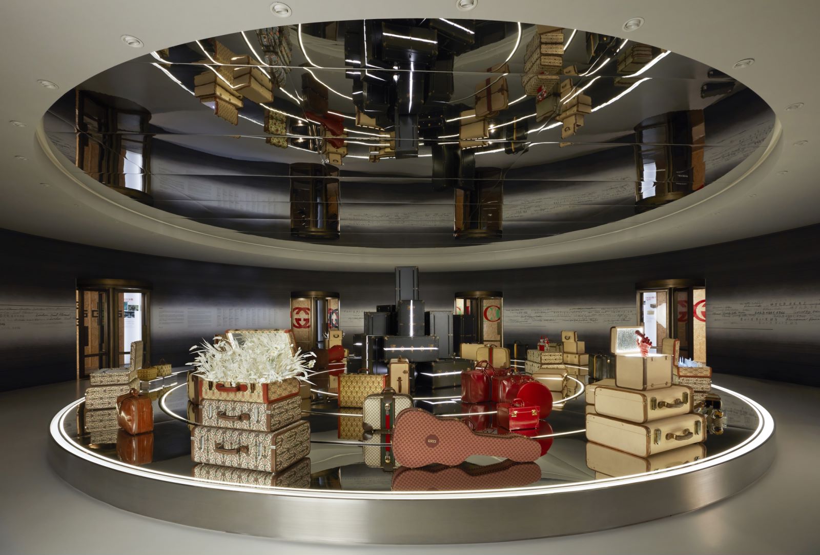 这是《寰宇古驰》典藏展的最后一个展厅,“苍穹殿堂(Duomo)”。两个佛罗伦萨圣母百花大教堂的圆形穹顶按比例复刻到展厅内部,两者互相倒置,中间由一个悬空的观景平台相连通。 这个构造让人亮相到象征循环和无限的符号“♾️️”,代表古驰的过去、现在和未来互相映衬、贯通。