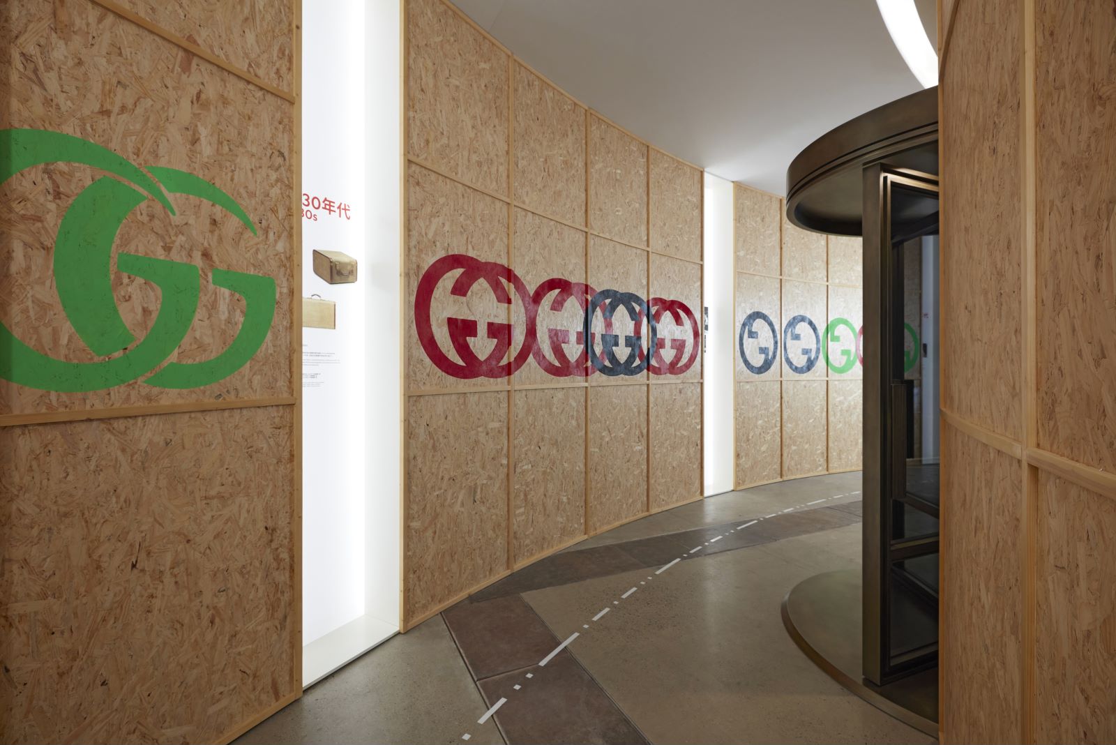 而呈现这些藏品的展厅便是“传送站(Portals)”,是《寰宇古驰》典藏展的开端。和许多奢侈品牌类似,古驰也是从箱包起步。古奇欧.古驰年轻时在伦敦萨沃伊酒店(The Savoy)酒店担任行李员的经历启发了他对箱包设计的灵感以及成立的品牌的决心,入口处的数道旋转门便是对萨沃伊酒店入口的致敬。