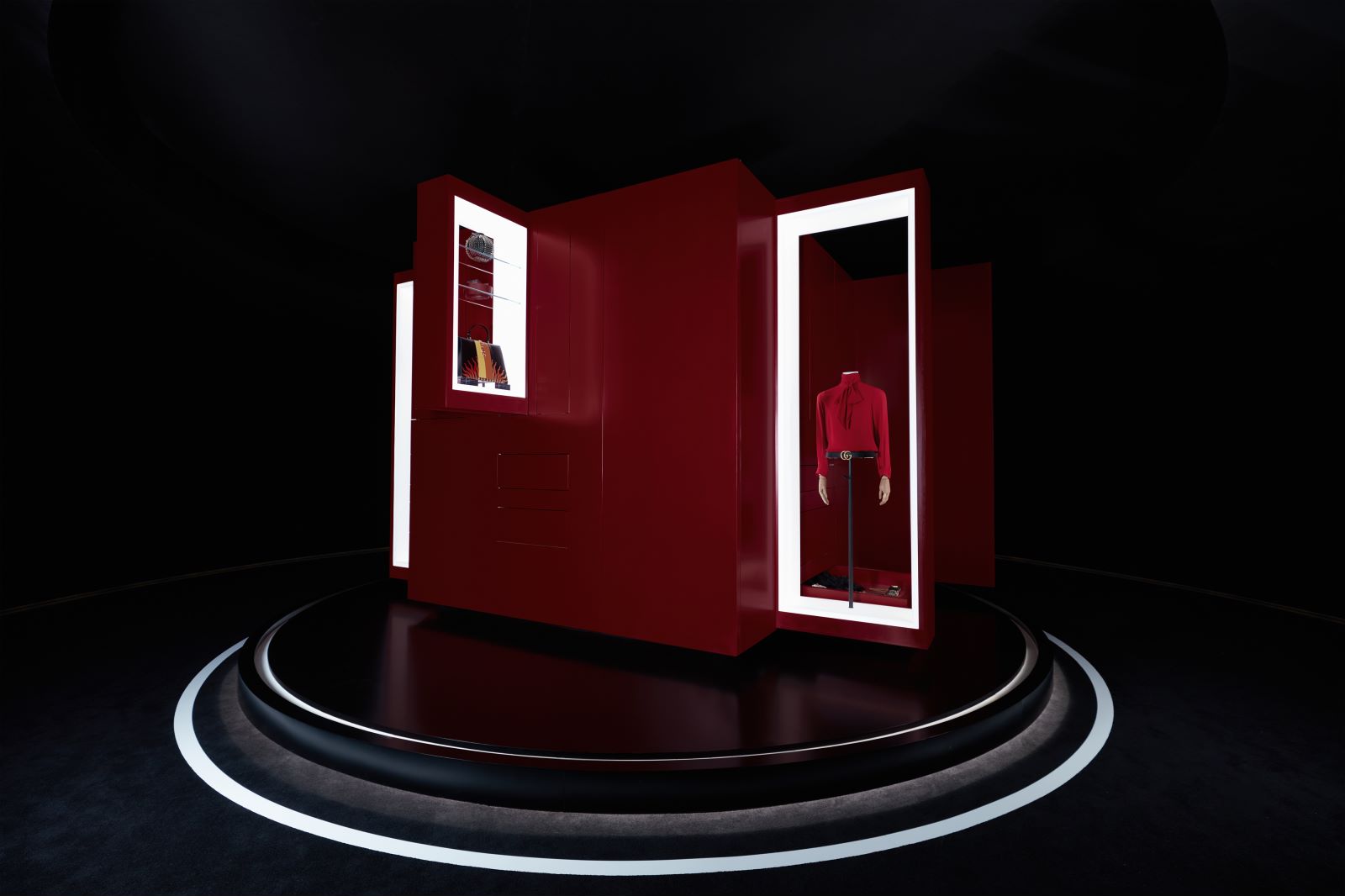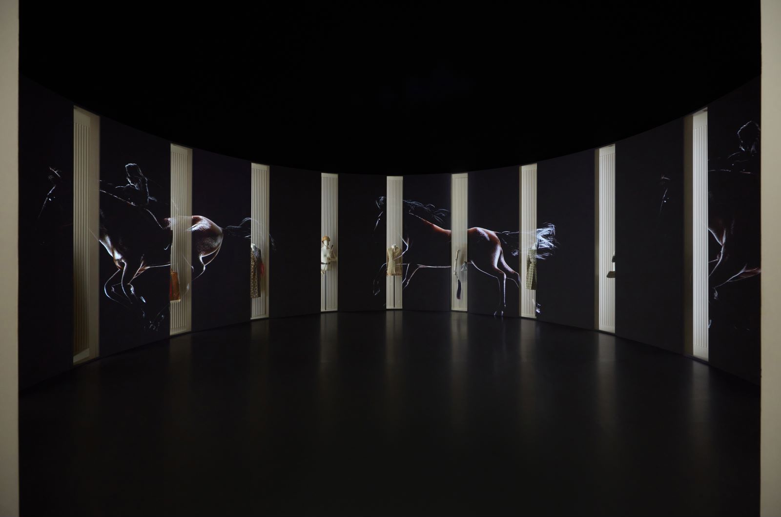 以“驰骋地”为例,环形场地的墙面上间隔装置大屏幕,用历史典藏和律动的马匹驰骋画面来呼应主题并提供沉浸式体验。镶嵌在屏幕之间的便是展示橱窗。奥尔多.古驰于1953年创作的马衔扣 (Horsebit) 象征以及以马腹带为灵感的经典绿红绿条纹织带(Web)是古驰马术基因的重要标识,也是贯穿整个展厅的线索。