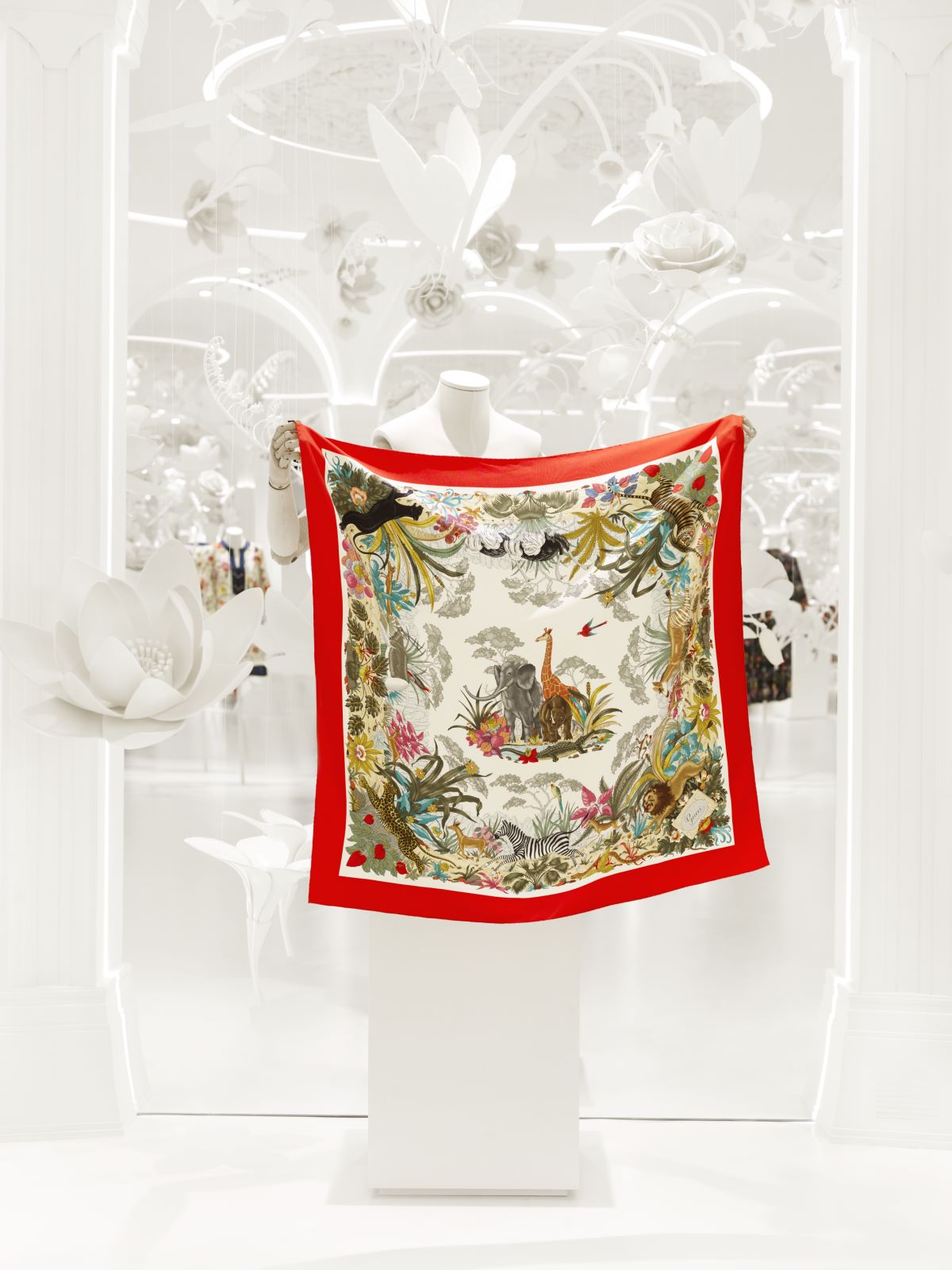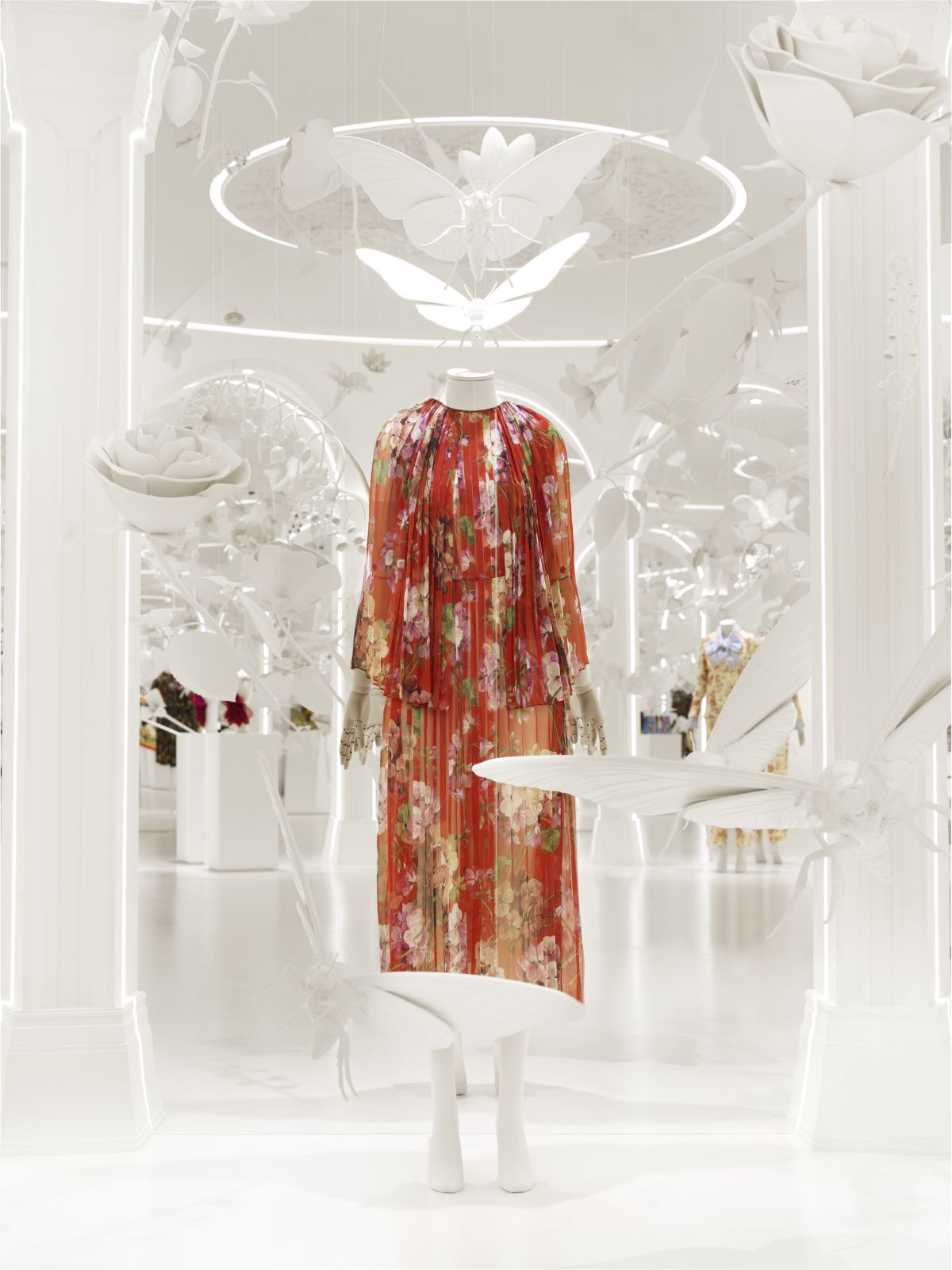 呼应元素之名,展厅铺设大量落地镜以及白色花卉和昆虫雕塑,以纯洁画面演绎花神芙洛拉的故事。从布景角度来看,以大量白色为背景映衬出古驰Flora印花创作的绚丽,镜面反射则能呈现出缤纷观感。