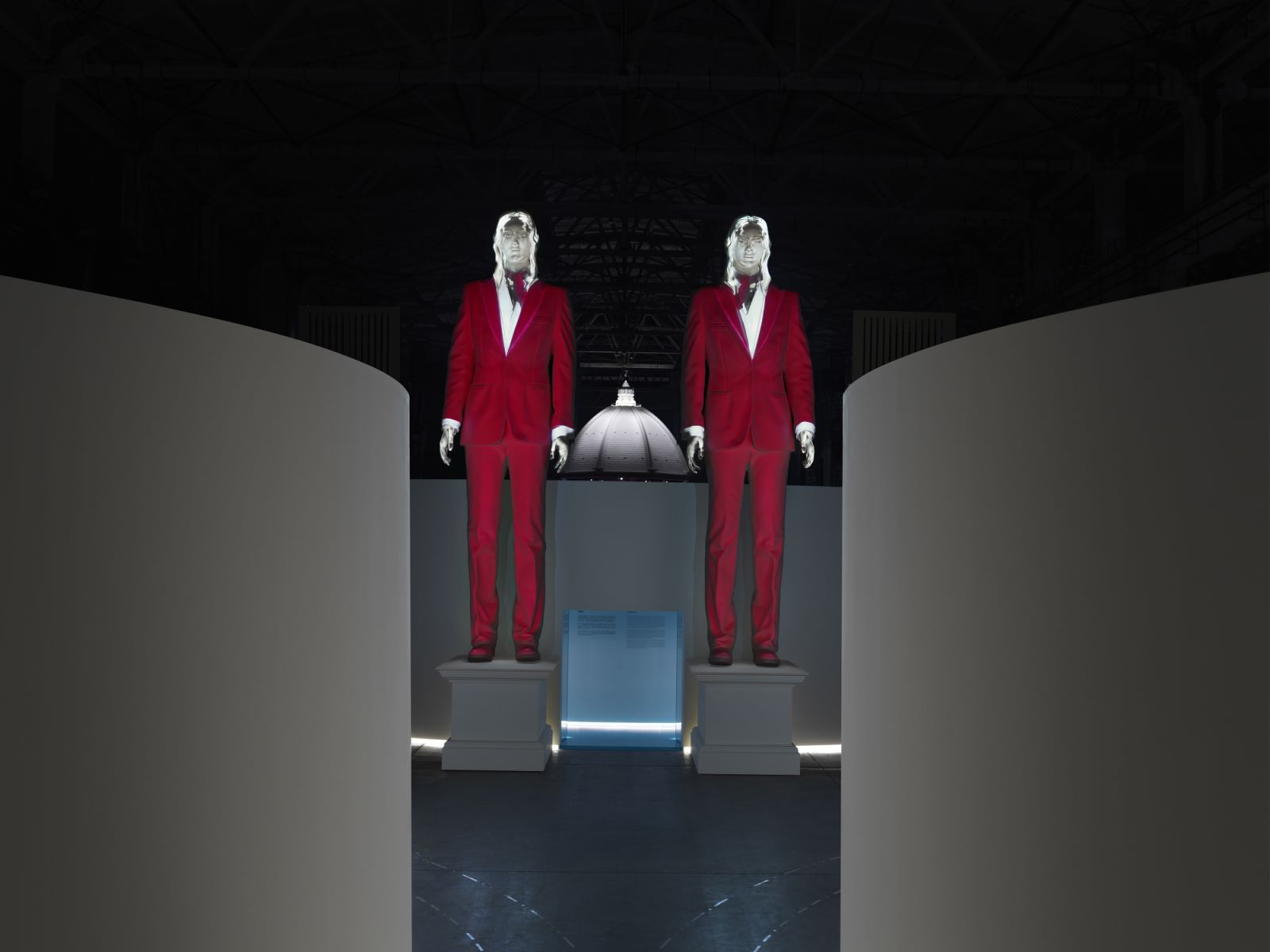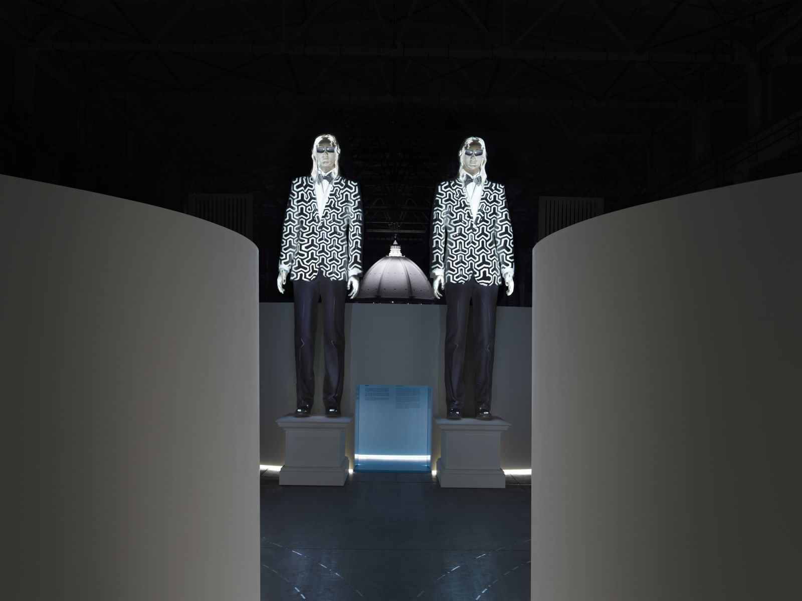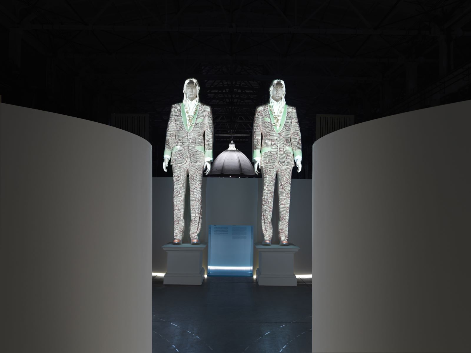 一对名为“偶(Two)”的十米白色雕塑讲述了古驰开创中性时尚观念及其对社会知行的影响。通过投影技术,多件经典的标志性男女套装在空白人像上不断呈现。