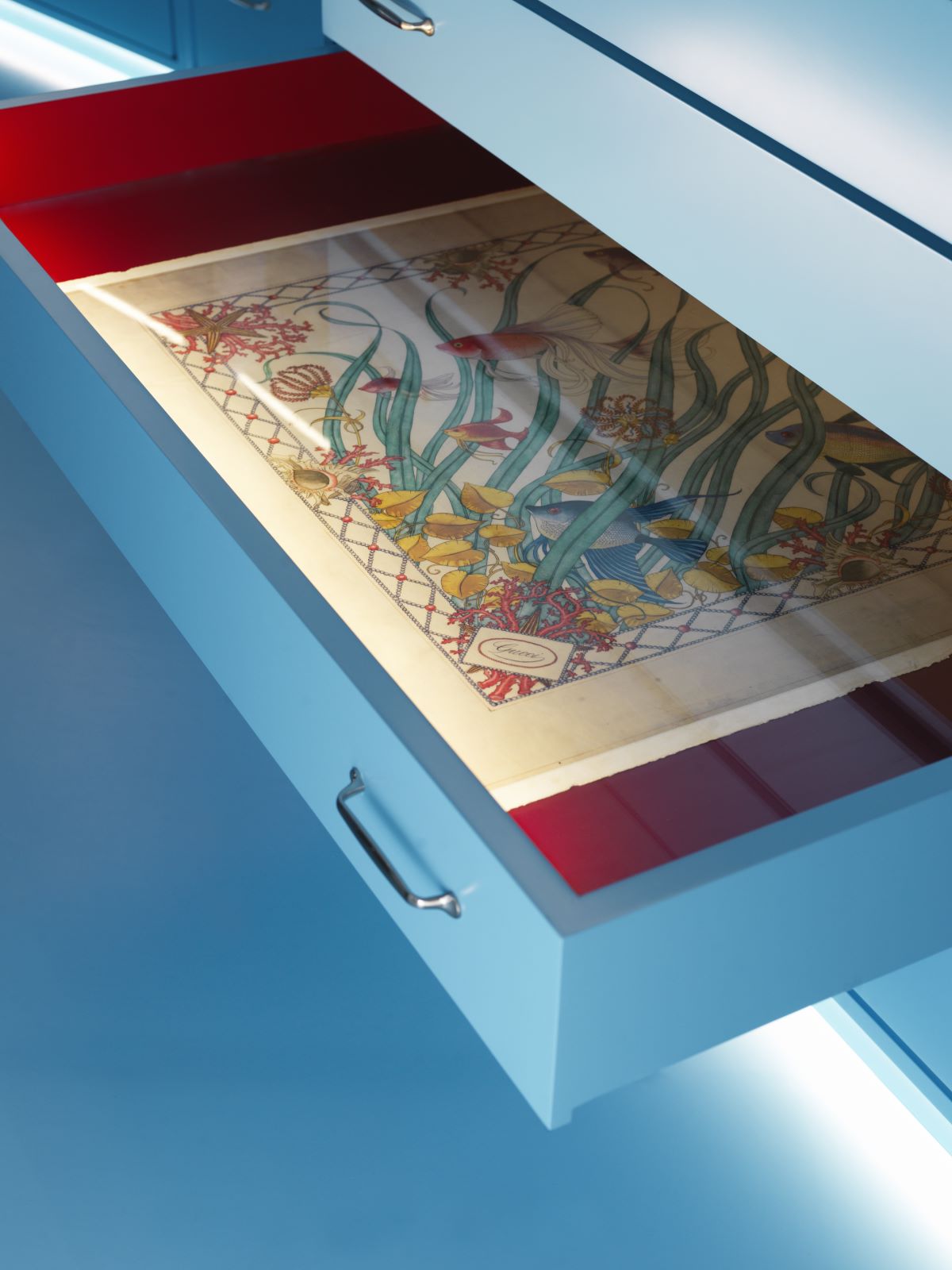 除了过去诸位创作总监设计的服饰,《寰宇古驰》典藏展最值得关注的地方还在于,其展出了大量过去从未通过展览在公众面前露面的作品。这些藏品均来自古驰典藏之家 (Gucci Archive),其前身为建于15世纪的佛罗伦萨塞蒂曼尼宫 (Palazzo Settimanni) ,如今即是品牌典藏档案馆,也是创意团队的工作中枢。