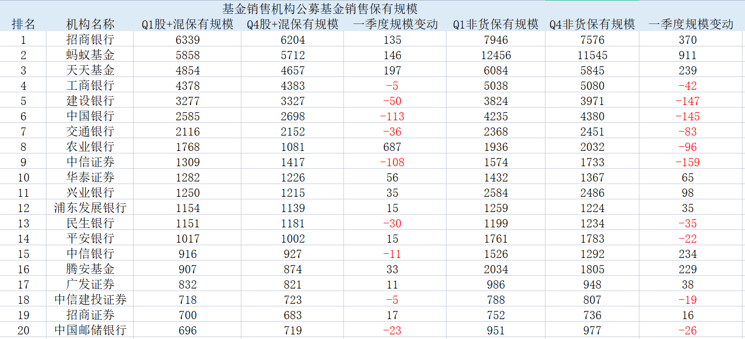 其中,招行、蚂蚁基金、天天基金仍稳居前三甲,三者的权益保有规模在一季度均增长超百亿元。