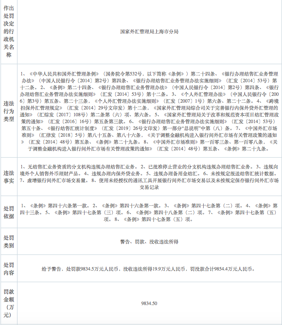 对此,国家外汇管理局上海市分局对该行给予警告,并处罚款9834.5万元人民币,没收违法所得19.9万元人民币,罚没款合计9854.4万元人民币。