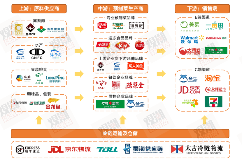 预制菜产业链的上游主要为原材料供应商,中游为预制菜生产商,下游为销售端,其中涵盖B端企业,也涵盖C端消费者。
