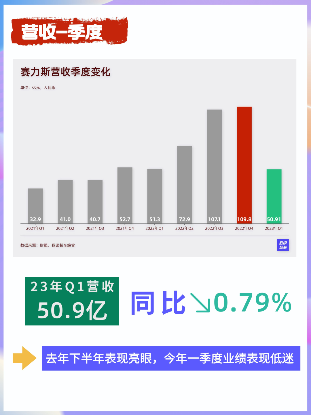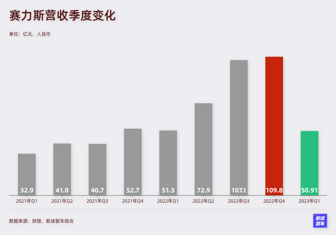 赛力斯全年营收341.05亿元,同比大增104%。这是赛力斯首次营收突破300亿,增速也是上市以来的最快增速。一季度营收只有50.91亿元,同比下降0.79%,环比降了53.64%。