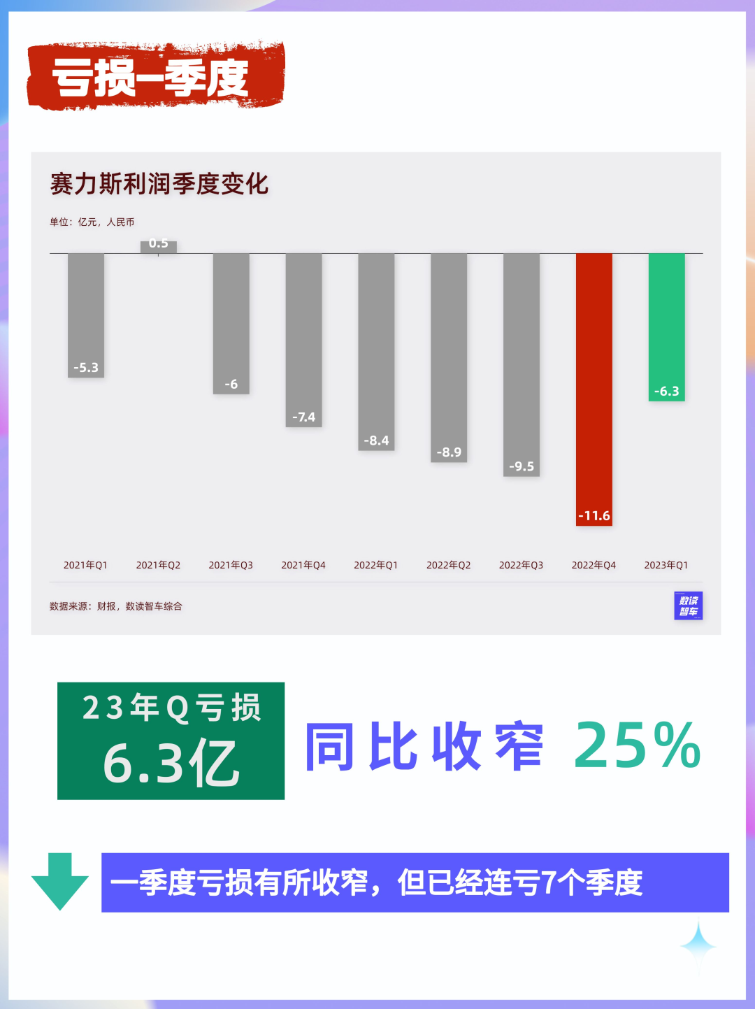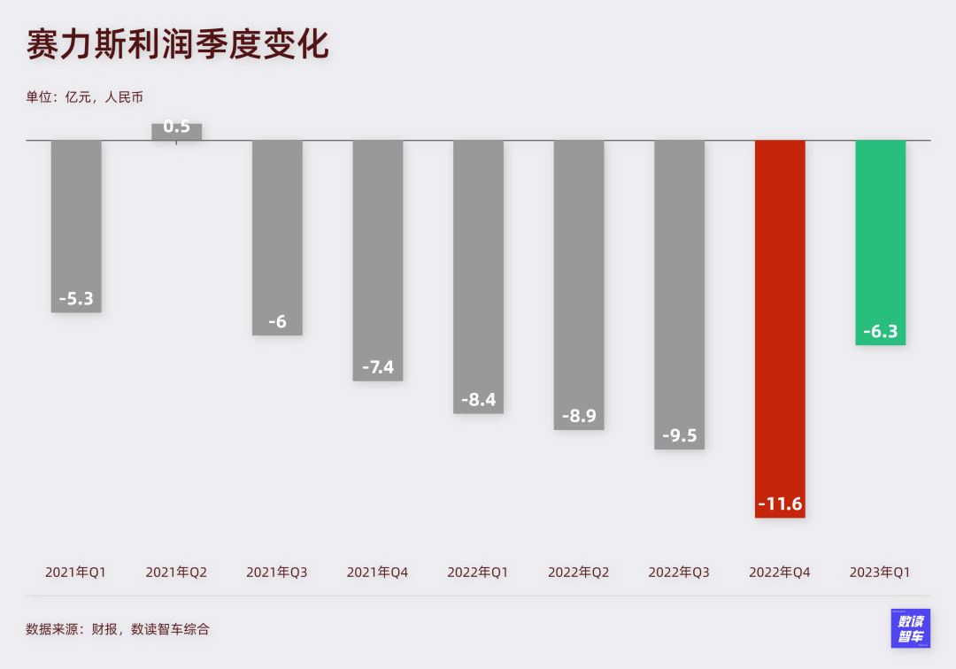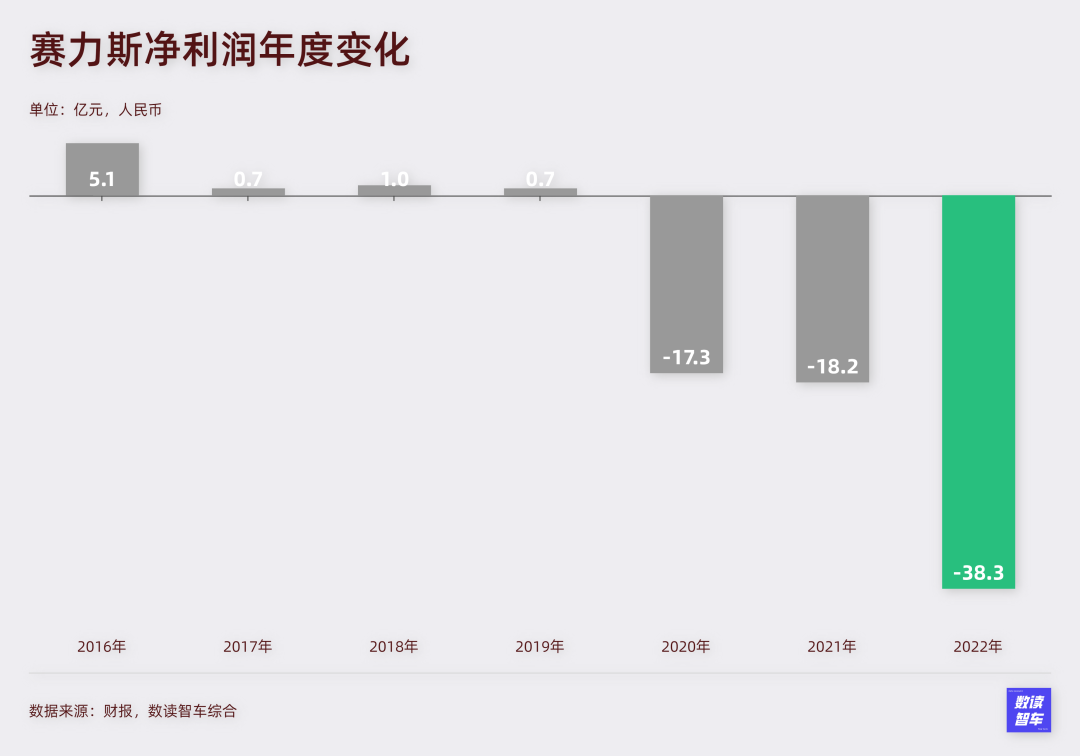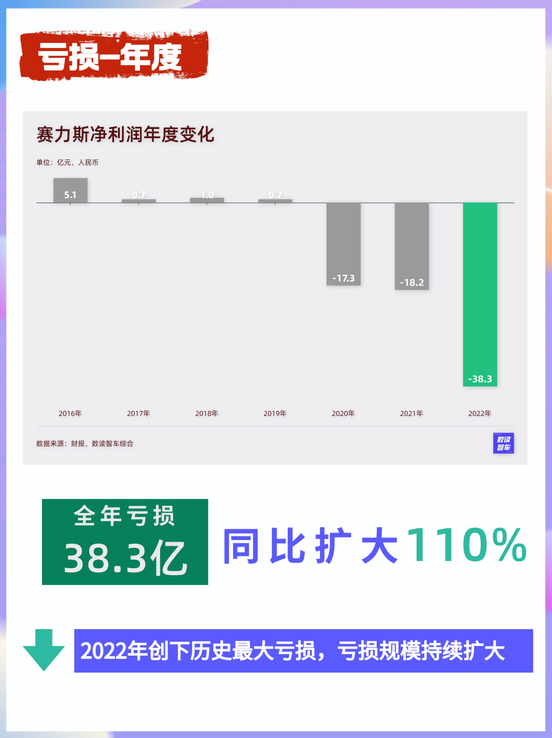 2022年,赛力斯亏损了38.32亿,同比扩大了110.1%,是上市以来的最大亏损。一季度虽然有所收窄,但已经是第7个季度连续亏损,合计亏损了近58亿。