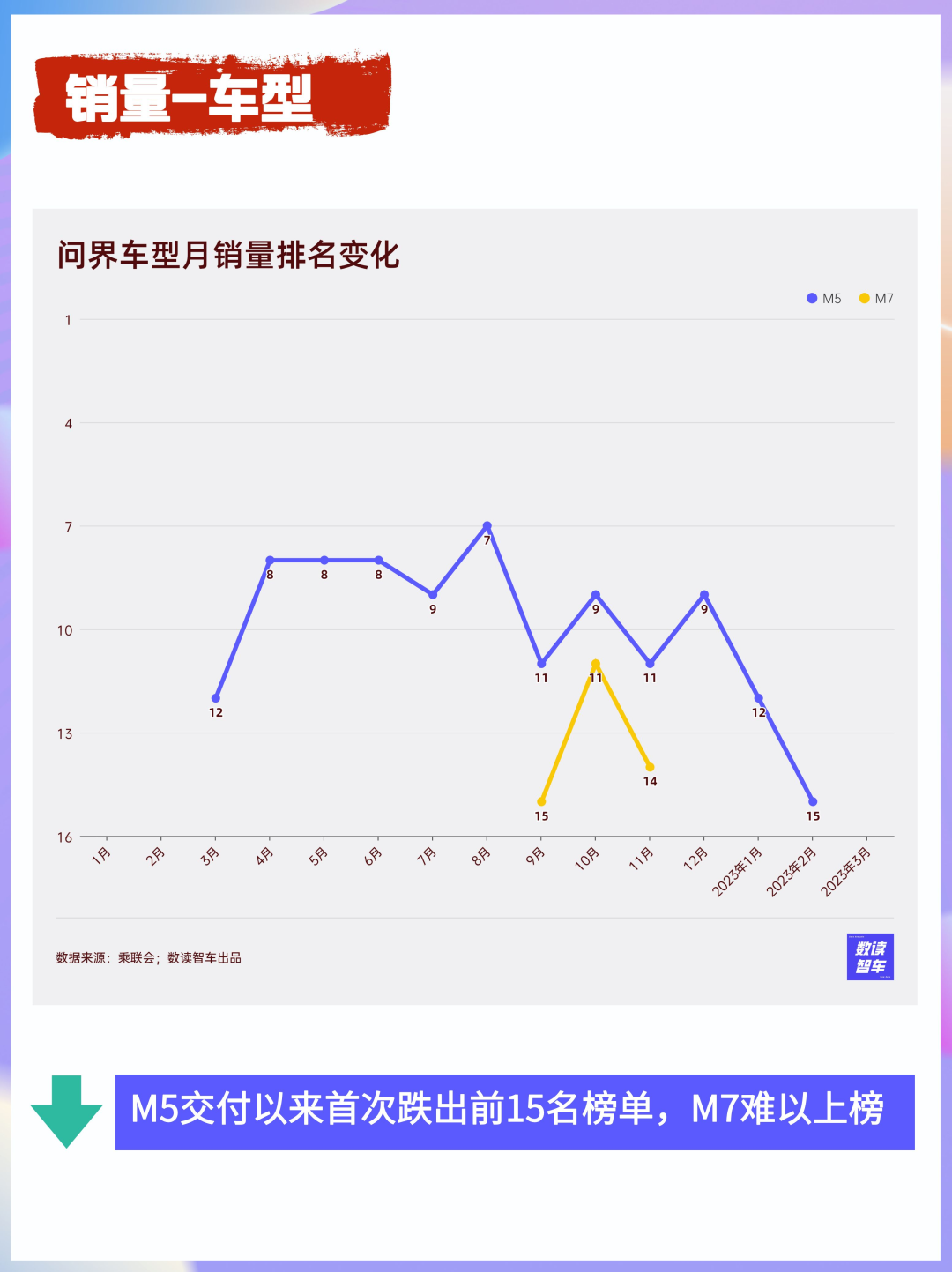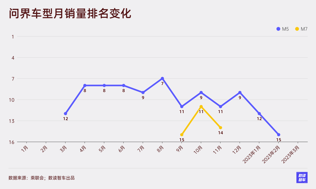 根据乘联会数据,问界M5月销量排名一直在10名左右,今年3月,交付以来首次跌出前15名。问界M7则只是短暂上榜三个月。