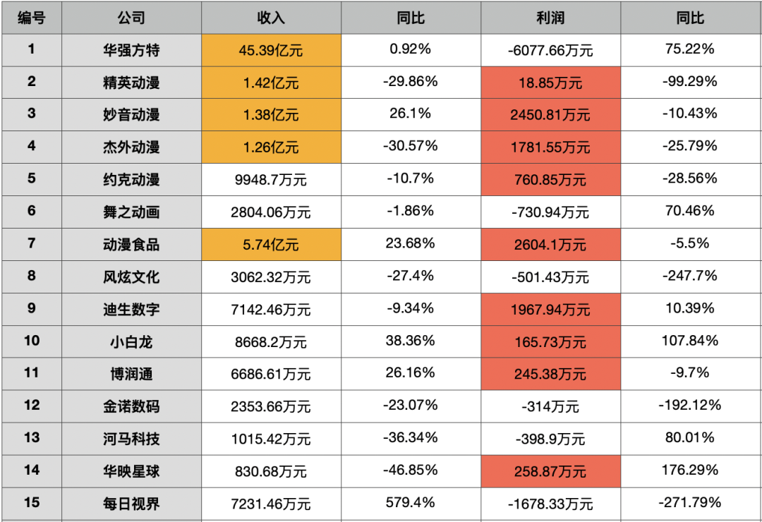 2021年,雷报也对新三板披露的动漫公司进行了报道,那时候能正常披露年报的是21家公司(21家动漫公司,5家营收过亿,15家营收超千万 | 雷报),收入破亿的公司基本没太大变化,公司盈利层面,变化比较大的是精英动漫,虽然收入破亿,但是净利润同比减少99.29%,只有18.85万元;此外,风炫文化、金诺数码、每日视界的净利润也同比减少200%左右;小白龙以及华映星球净利润则同比增长100%以上。