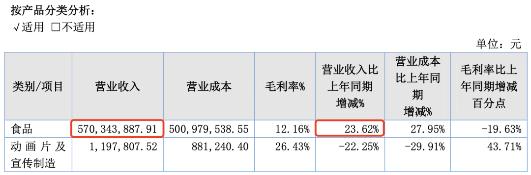 唯诺冠动漫食品的主要收入来源于食品,2022年该业务收入5.7亿元,同比增长23.62%,动画片及宣传制造业务收入119.8万元,同比减少22.25%。