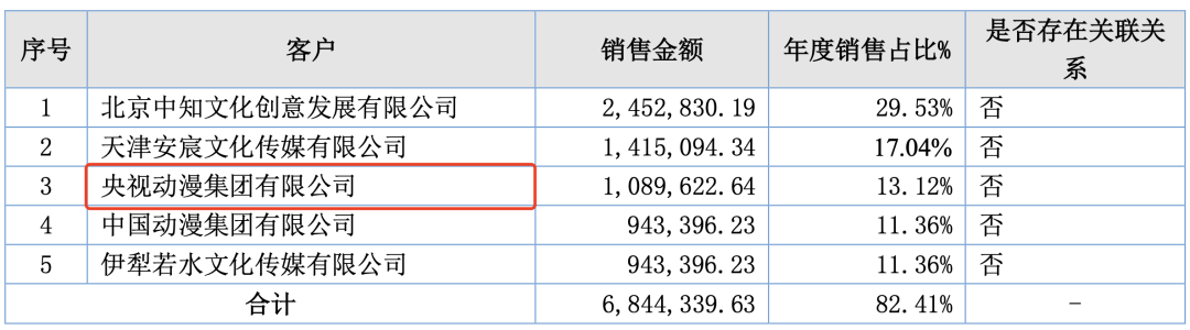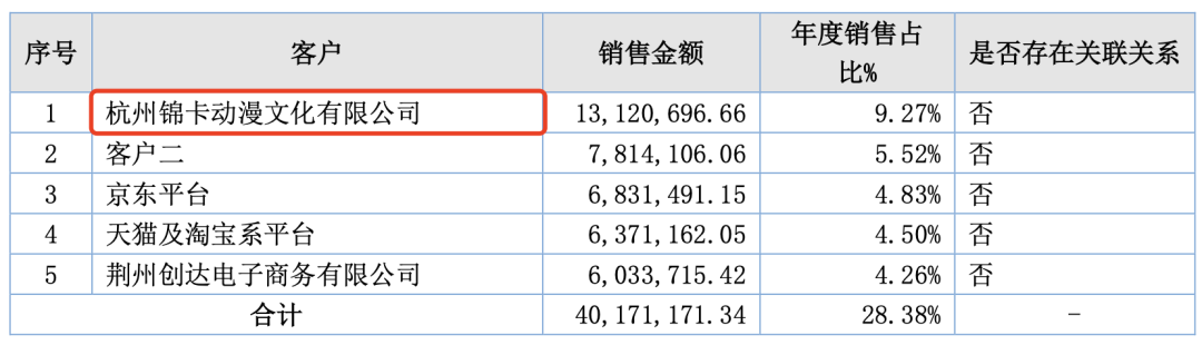 2022年,精英动漫与卡游以及卡游投资的动画公司锦卡动漫联合打造的新锐国产动画《维将》,动画已经在腾讯、爱奇艺、芒果TV、优酷等全视频平台同步播放。 锦卡动漫也成为了精英动漫五大客户之一,为精英动漫贡献了1312.07万元的收入,占比9.27%。除此之外,来自京东以及天猫等淘宝系平台的玩具销售收入分别为683.15万元及637.12万元。