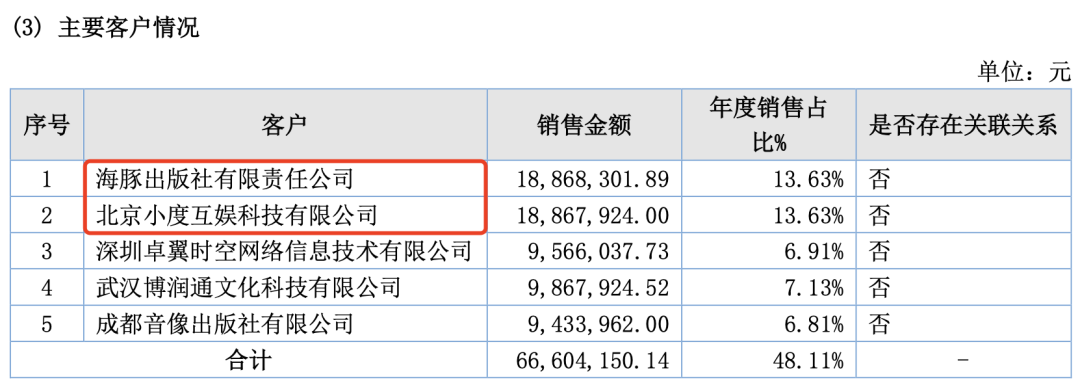 根据公告介绍,妙音数科受托制作产品收入较去年同期增加了48.63%,主要是因为承接的商业动画项目和软件开发项目增加;报告期内新增了信息服务收入,为妙音国学APP承接的信息流推广收入;衍生产品收入较去年同期增加了113.18%,主要是因为今年新增了国学互联网直播收入。百度旗下的小度互娱与海豚出版社都是妙音数科的重要客户。