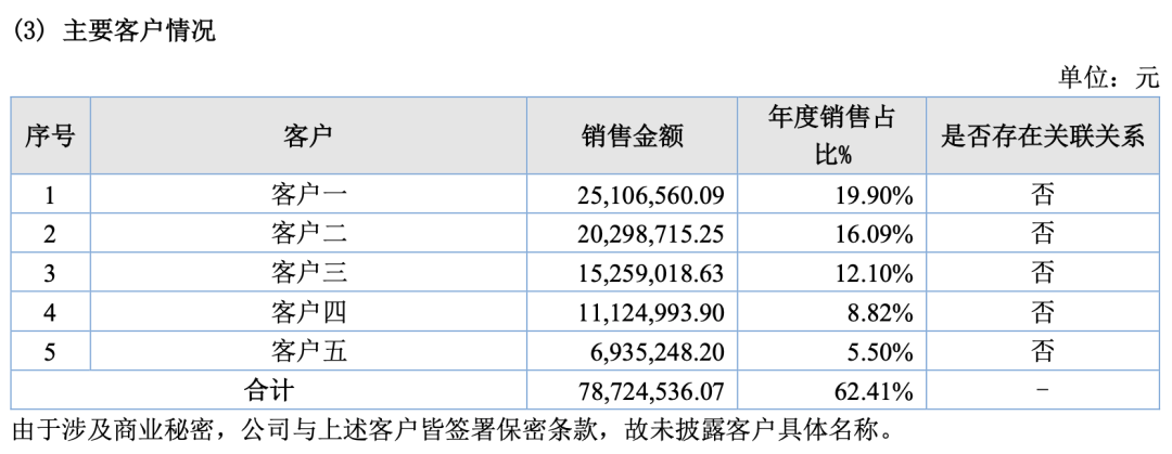 以上收入主要来自前五大客户的贡献,其中,客户一贡献收入2510.7万元,客户二贡献收入2029.9万元,客户三贡献收入1525.9万元,客户四贡献1112.5万元,客户五贡献693.5万元,2022年前五大客户收入占比62.41%。
