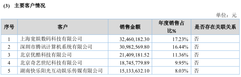 从以上收入及占比来看,并没有发生太大变化,所以,上述五大客户基本确定为还是以上五家视频平台。